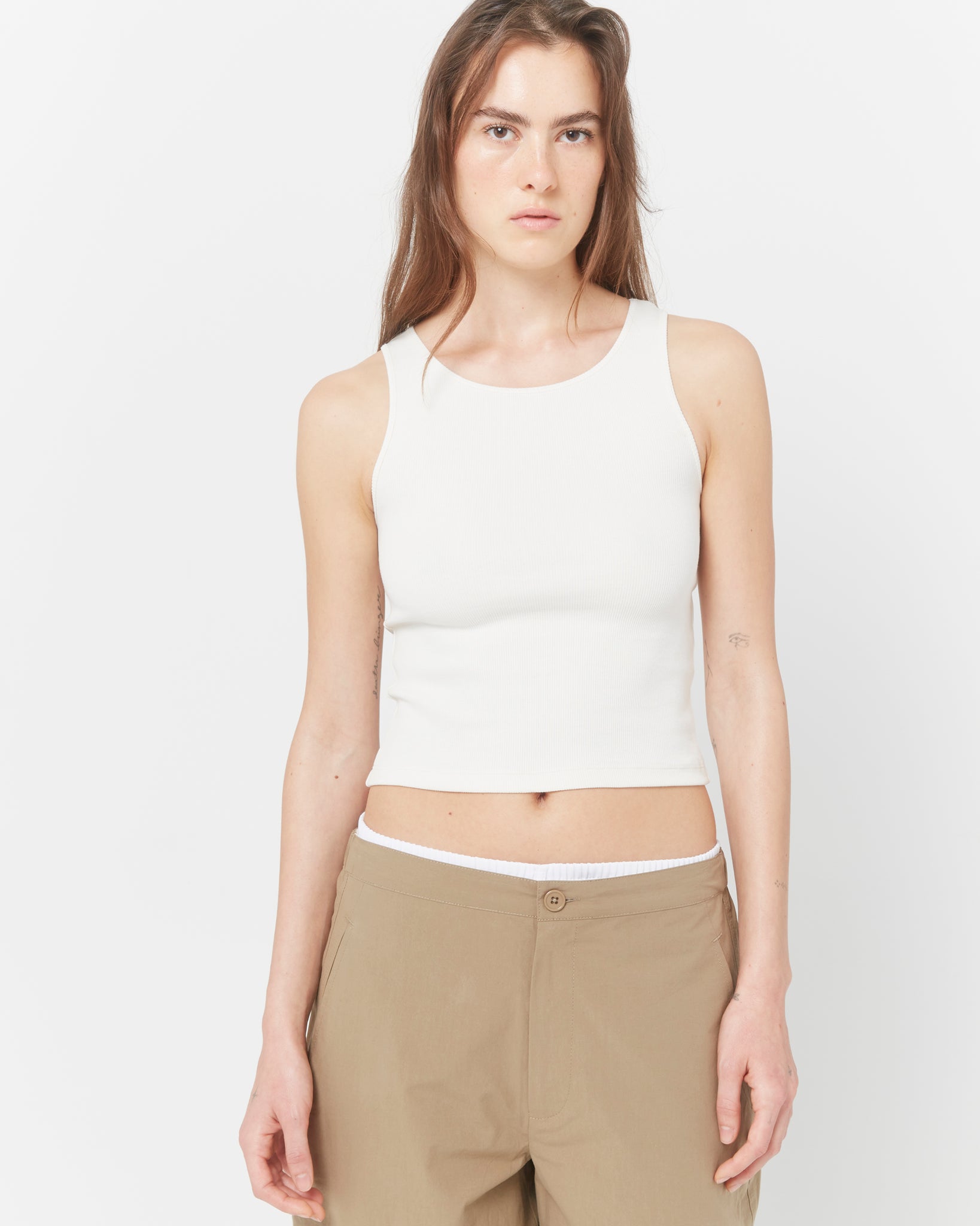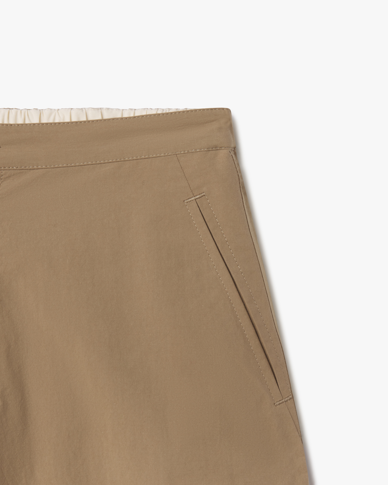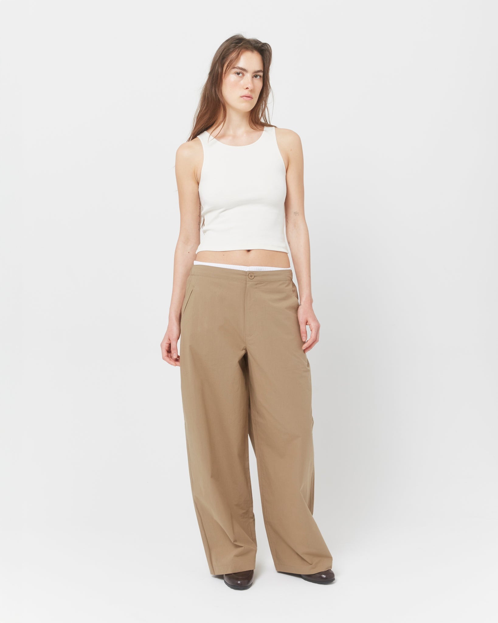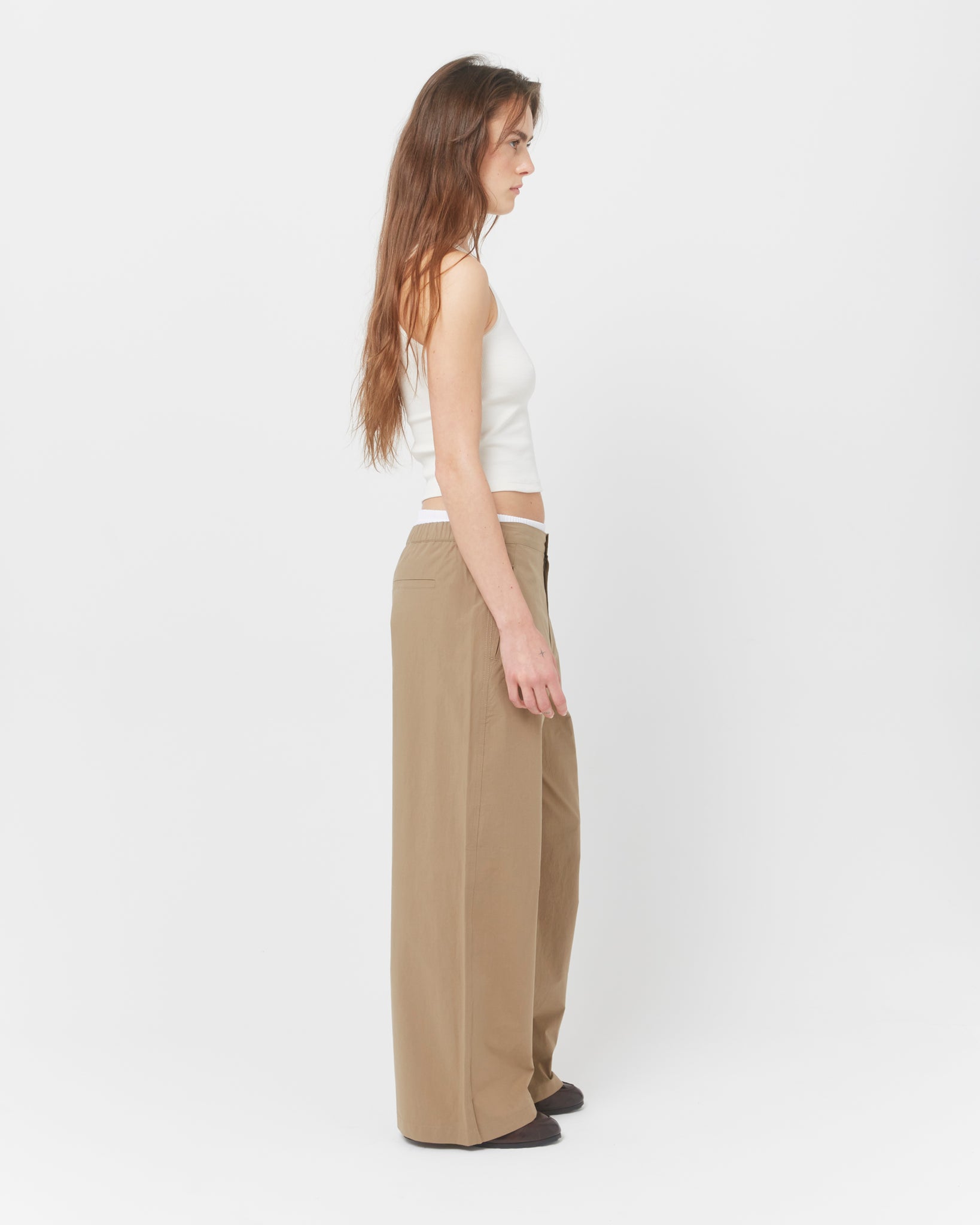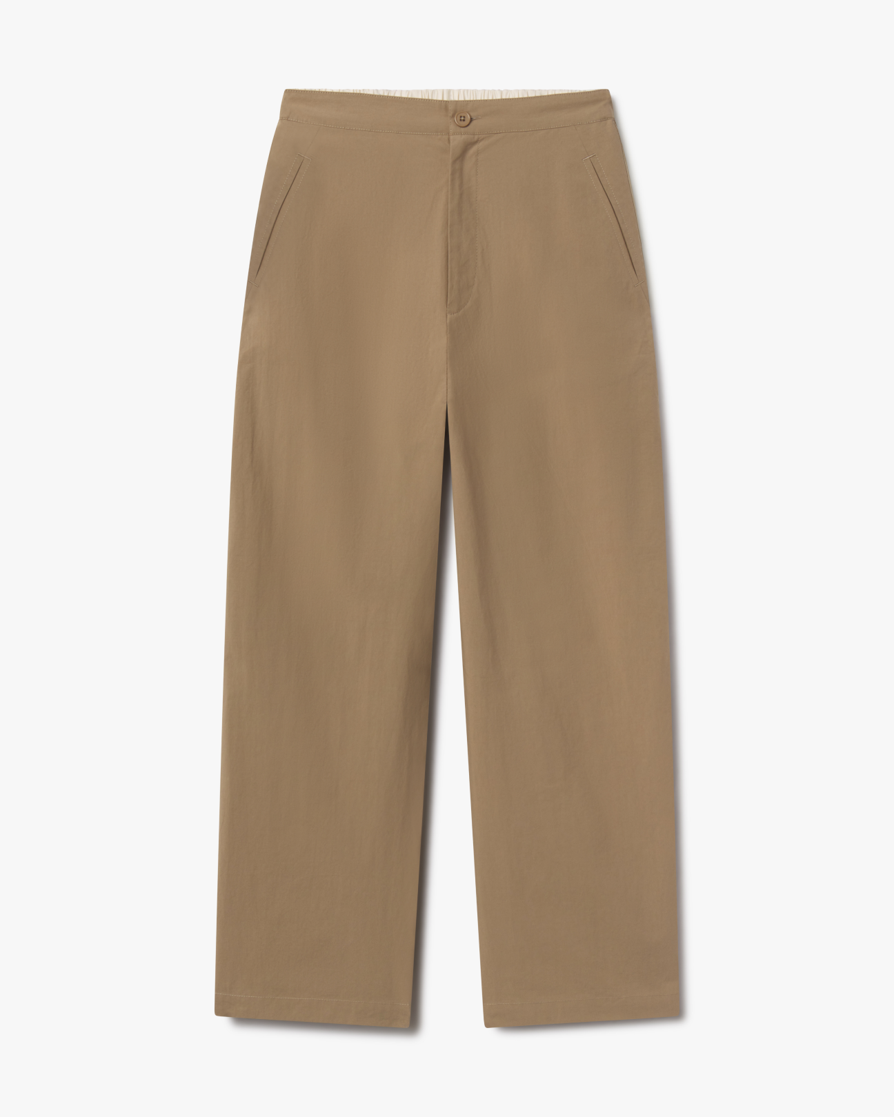 A wide, straight-leg pant cut from lightweight brushed cotton canvas. Designed with a clean front and an elasticated back waist, finished with a button-zip closure. Two front pockets and a single back pocket add utility. The contrast fabric at the waist allows the pant to be worn as intended or rolled down for a lower rise.