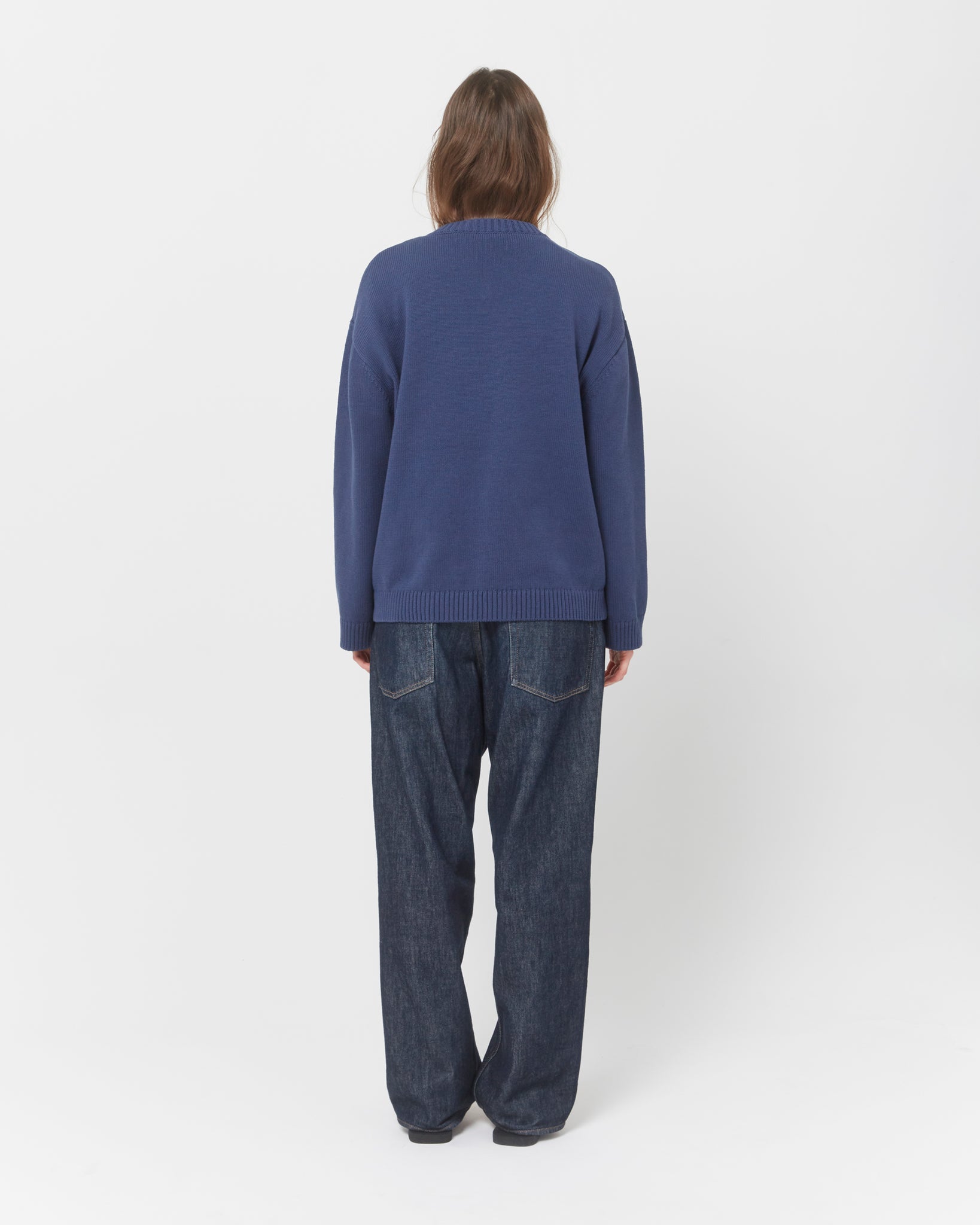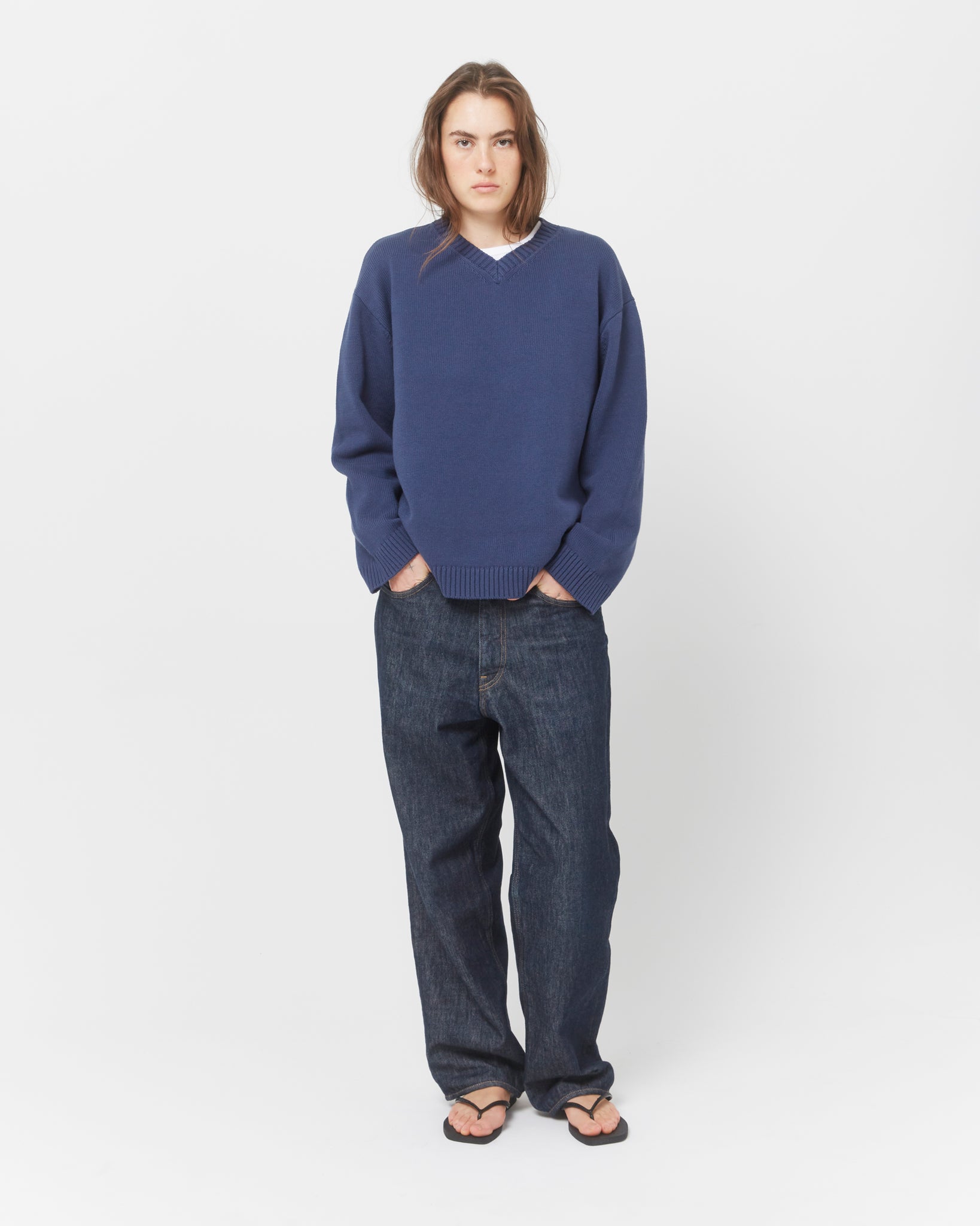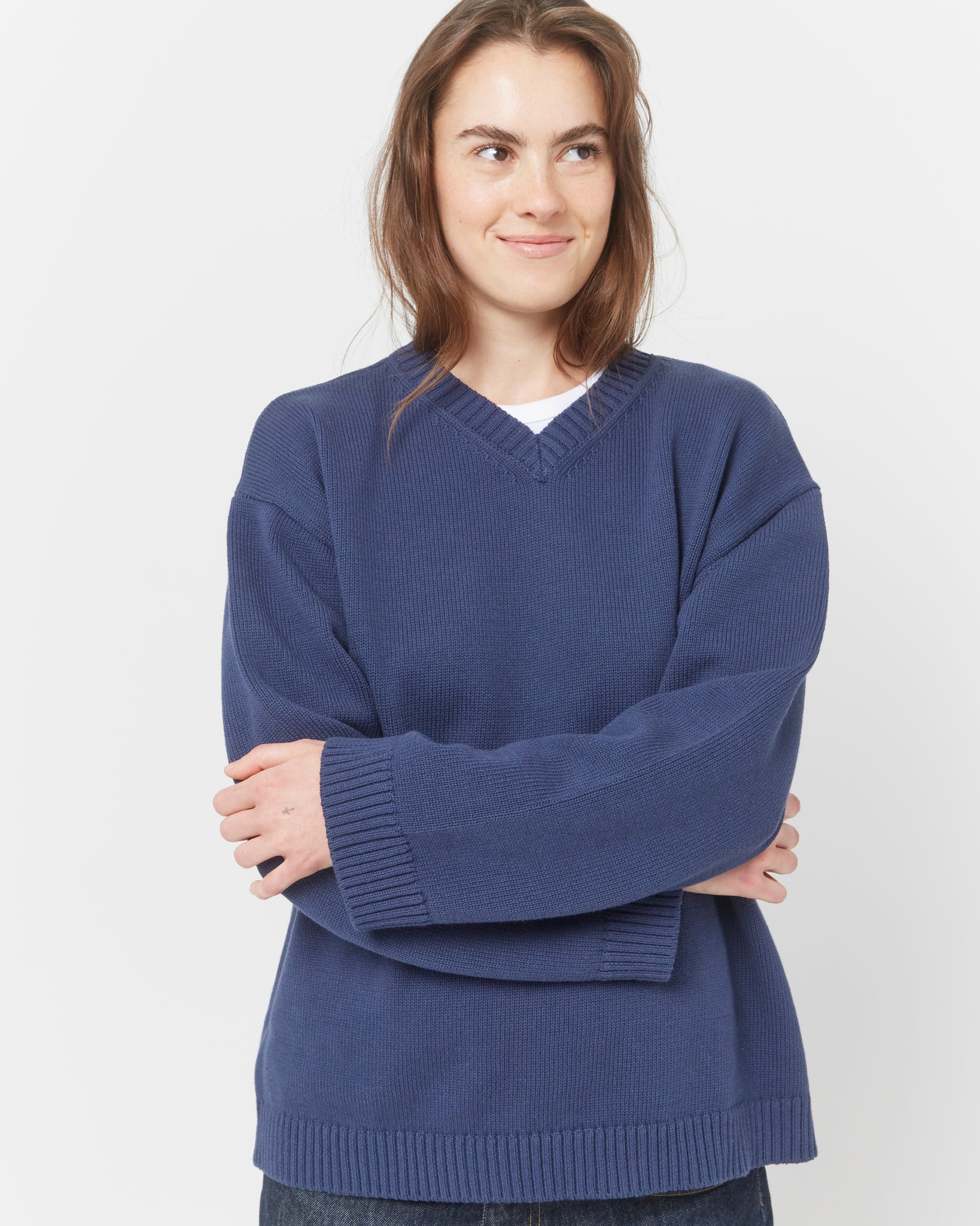 Our best-selling V-neck sweater is crafted from soft, mediumweight cotton yarn for an elevated yet relaxed fit. Featuring dropped shoulders, wide cuffs, and fully fashioned finishes.